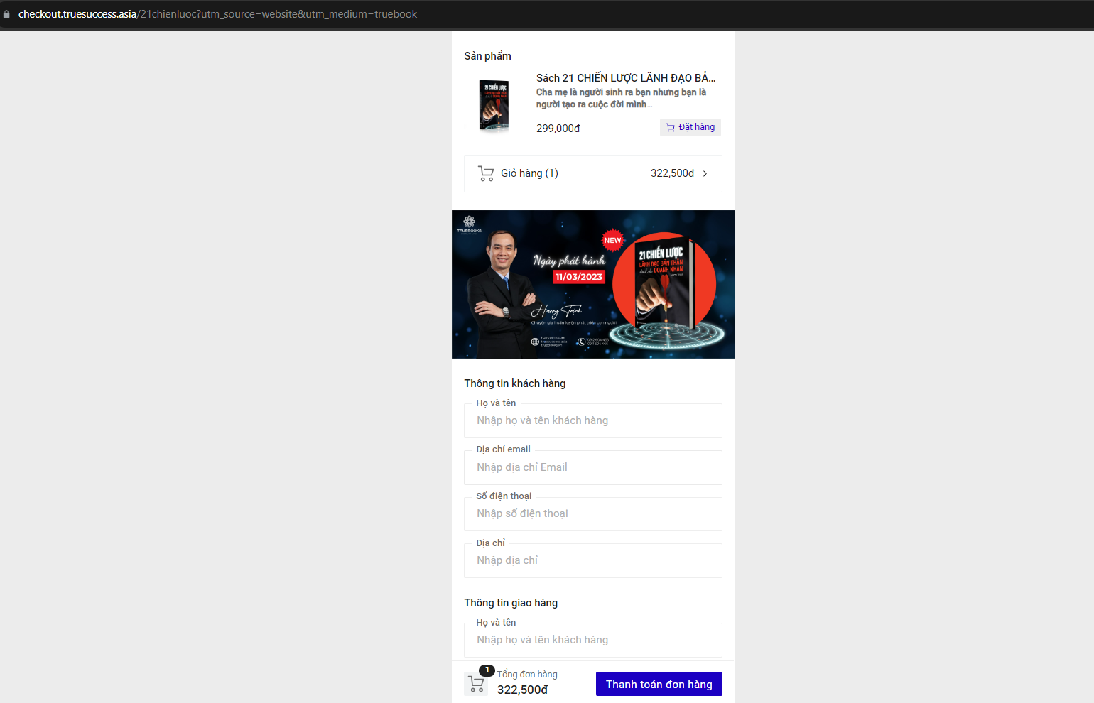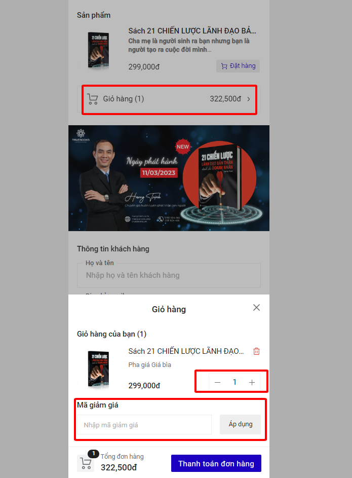 + Điền đầy đủ thông tin cần thiết, mã giảm giá (nếu có) để True Books có thể liên lạc theo thông tin mà bạn cung cấp. Bạn tiếp tục cuộn xuống để xem thông tin đơn hàng và phương thức thanh toán trước khi đặt hàng. Khách hàng lưu ý rà soát kỹ và xác nhận thông tin chi tiết về từng giao dịch thanh toán trước khi thực hiện việc thanh toán.