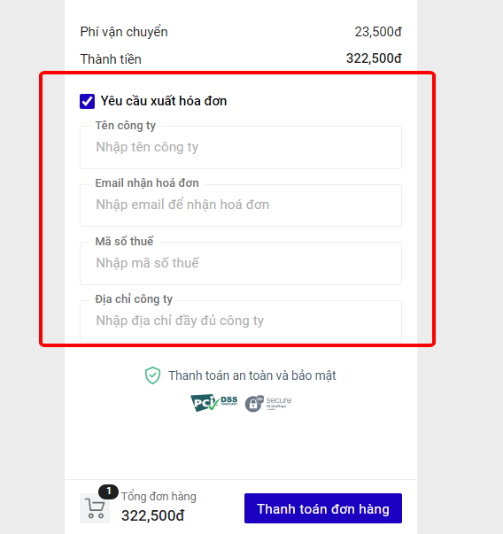 Bạn có thể yêu cầu xuất hóa đơn sau khi thanh toán khi nhập đủ/ chính xác Tên công ty, Mã số thuế, Email, Địa chỉ công ty